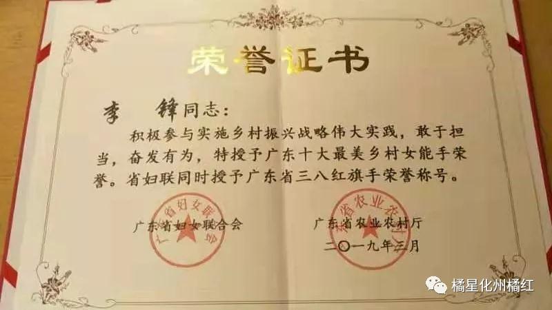 由廣東(dōng)省婦女(nǚ)聯合會(huì)、廣東(¶≥dōng)省農(nóng)業(yè)農(←≠nóng)村(cūn)廳聯合評定的(de)“廣東(dōng)省十大(dà)鄉(xi☆āng)村(cūn)女(nǚ)能(néng)手&rdqu≤o;評選活動于2019年(nián)2月(yuè)28日(rì)在“廣≤©♦東(dōng)各界婦女(nǚ)紀念“≠$三八”國(guó)際婦女(nǚ)節109周年(nián)大(dà¥σ)會(huì)”上(shàng)揭曉,化州橘紅技術 ₹開發有限公司董事(shì)長(cháng☆≈)李鋒榮獲“廣東(dōng)省十大(dà)鄉(xiān★'g)村(cūn)女(nǚ)能(néng)手&rdq"↑uo;殊榮,同時(shí)被廣東(dōng)省婦聯授予&ldq ¥uo;廣東(dōng)省三八紅(hóng)旗手”榮譽稱号♣&&!